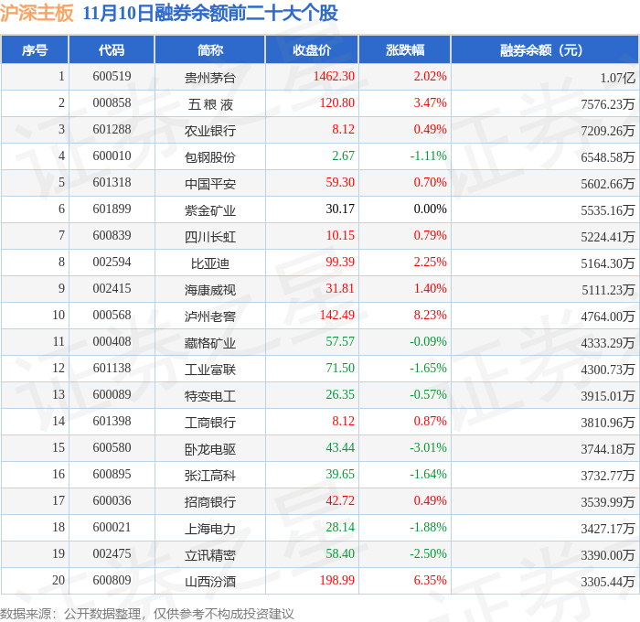 沪深主板融券余额前三分别为:贵州茅台(600519)融券余额1.07亿元、五 粮 液(000858)融券余额7576.23万元、农业银行(601288)融券余额7209.26万元,前20具体见下表: