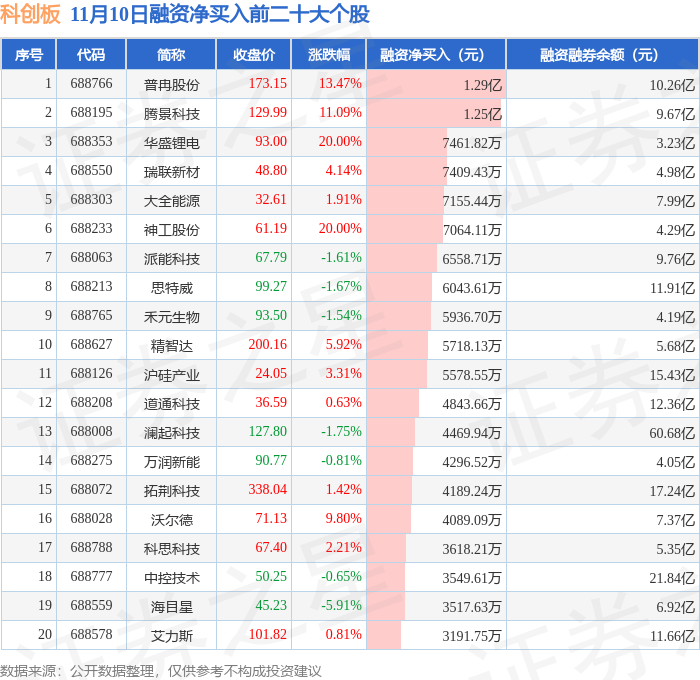 科创板融资净买入前三分别为:普冉股份(688766)融资净买入1.29亿元、腾景科技(688195)融资净买入1.25亿元、华盛锂电(688353)融资净买入7461.82万元,前20具体见下表: