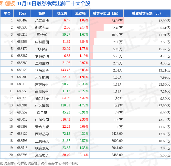 科创板融券净卖出前三分别为:芯联集成(688469)融券净卖出54.93万股、和辉光电(688538)融券净卖出22.4万股、思特威(688213)融券净卖出10.85万股,前20具体见下表:
