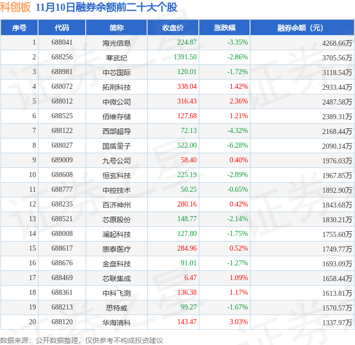 科创板融券余额前三分别为:海光信息(688041)融券余额4268.66万元、寒武纪(688256)融券余额3705.56万元、中芯国际(688981)融券余额3118.54万元,前20具体见下表: