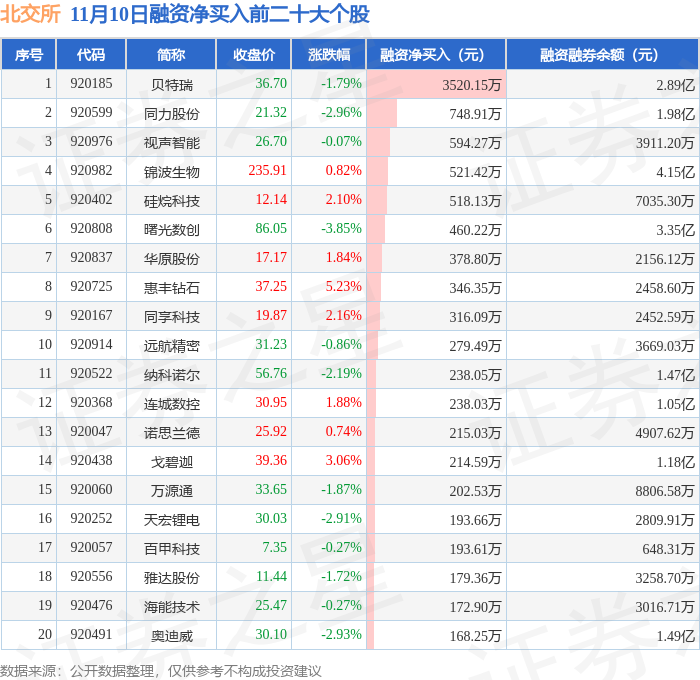 北交所融资净买入前三分别为:贝特瑞(920185)融资净买入3520.15万元、同力股份(920599)融资净买入748.91万元、视声智能(920976)融资净买入594.27万元,前20具体见下表: