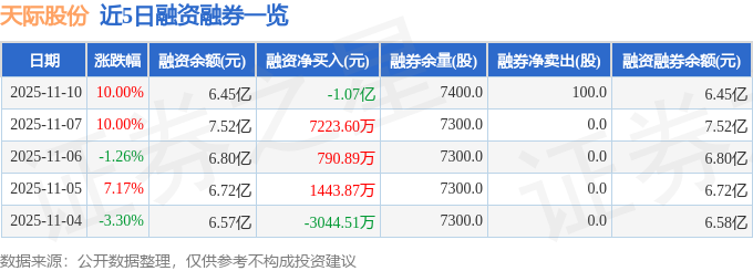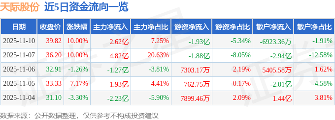 证券之星消息,截至2025年11月10日收盘,天际股份(002759)报收于39.82元,上涨10.0%,已连续涨停2天,换手率18.26%,成交量91.49万手,成交额36.18亿元。