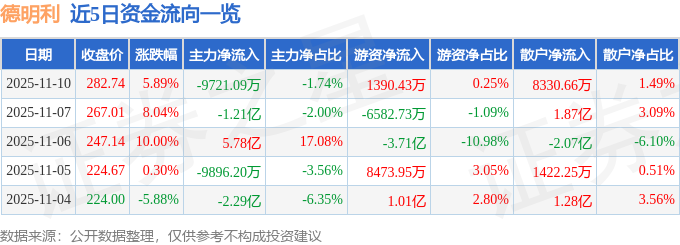 证券之星消息,截至2025年11月10日收盘,德明利(001309)报收于282.74元,上涨5.89%,换手率12.56%,成交量20.2万手,成交额55.87亿元。