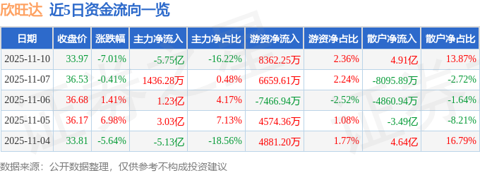 证券之星消息,截至2025年11月10日收盘,欣旺达(300207)报收于33.97元,下跌7.01%,换手率5.95%,成交量101.91万手,成交额35.44亿元。