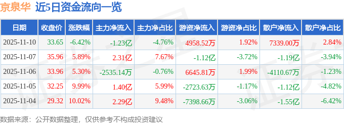 证券之星消息,截至2025年11月10日收盘,京泉华(002885)报收于33.65元,下跌6.42%,换手率32.48%,成交量75.0万手,成交额25.86亿元。