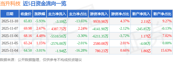 证券之星消息,截至2025年11月10日收盘,当升科技(300073)报收于65.83元,下跌5.93%,换手率6.66%,成交量33.68万手,成交额22.73亿元。