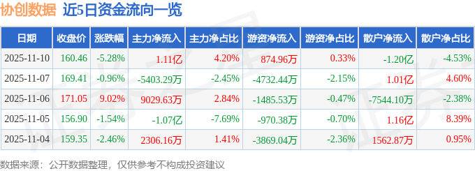 证券之星消息,截至2025年11月10日收盘,协创数据(300857)报收于160.46元,下跌5.28%,换手率4.81%,成交量16.62万手,成交额26.5亿元。