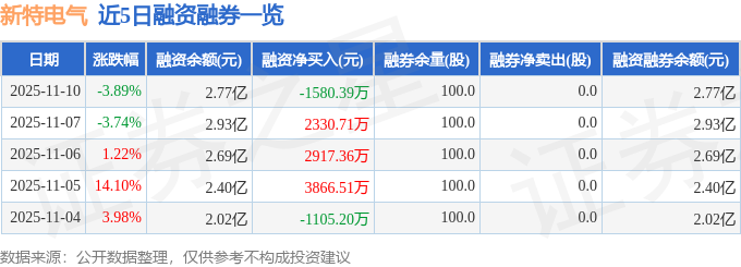 新特电气融资融券信息显示,融资方面,当日融资买入1.31亿元,融资偿还1.47亿元,融资净偿还1580.39万元。融券方面,融券卖出0.0股,融券偿还0.0股,融券余量100.0股,融券余额0.22万元。融资融券余额2.77亿元。