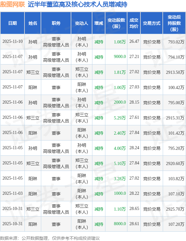 殷图网联近半年内的董监高及核心技术人员增减持详情如下:
