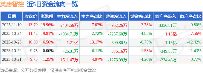 证券之星消息,截至2025年11月10日收盘,英唐智控(300131)报收于13.7元,上涨19.96%,涨停,换手率2.4%,成交量25.0万手,成交额3.42亿元。