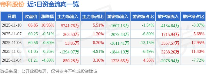 证券之星消息,截至2025年11月10日收盘,帝科股份(300842)报收于66.85元,上涨10.95%,换手率12.19%,成交量15.8万手,成交额10.42亿元。