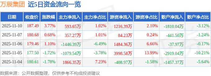 证券之星消息,截至2025年11月10日收盘,万辰集团(300972)报收于187.49元,上涨3.77%,换手率1.88%,成交量3.15万手,成交额5.8亿元。