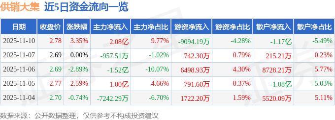 证券之星消息,截至2025年11月10日收盘,供销大集(000564)报收于2.78元,上涨3.35%,换手率5.27%,成交量774.77万手,成交额21.26亿元。