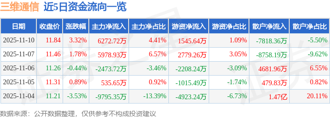 证券之星消息,截至2025年11月10日收盘,三维通信(002115)报收于11.84元,上涨3.32%,换手率16.12%,成交量121.25万手,成交额14.22亿元。