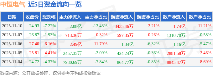 证券之星消息,截至2025年11月10日收盘,中恒电气(002364)报收于24.93元,下跌7.22%,换手率10.99%,成交量61.31万手,成交额15.51亿元。