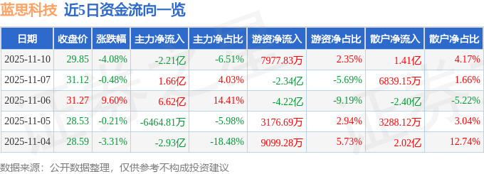11月10日的资金流向数据方面,主力资金净流出2.21亿元,占总成交额6.51%,游资资金净流入7977.83万元,占总成交额2.35%,散户资金净流入1.41亿元,占总成交额4.17%。