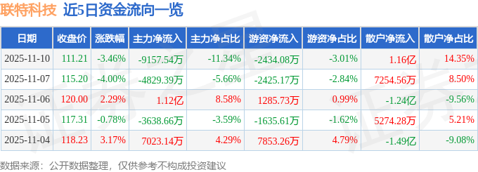 证券之星消息,截至2025年11月10日收盘,联特科技(301205)报收于111.21元,下跌3.46%,换手率10.72%,成交量7.29万手,成交额8.08亿元。