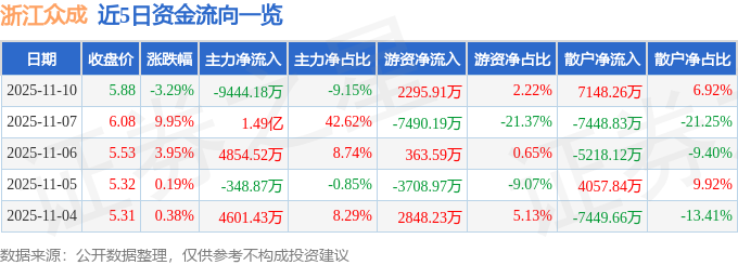 证券之星消息,截至2025年11月10日收盘,浙江众成(002522)报收于5.88元,下跌3.29%,换手率18.95%,成交量171.51万手,成交额10.33亿元。
