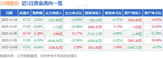 证券之星消息,截至2025年11月10日收盘,川润股份(002272)报收于15.53元,下跌2.45%,换手率8.55%,成交量33.04万手,成交额5.13亿元。