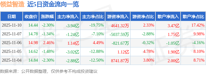 证券之星消息,截至2025年11月10日收盘,领益智造(002600)报收于14.44元,下跌2.3%,换手率1.91%,成交量137.82万手,成交额19.93亿元。