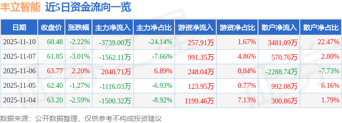 证券之星消息,截至2025年11月10日收盘,丰立智能(301368)报收于60.48元,下跌2.22%,换手率3.98%,成交量2.55万手,成交额1.55亿元。