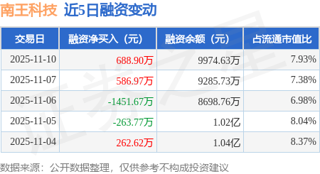 证券之星消息,11月10日,南王科技(301355)融资买入1085.08万元,融资偿还396.18万元,融资净买入688.9万元,融资余额9974.63万元。