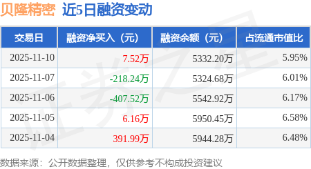证券之星消息,11月10日,贝隆精密(301567)融资买入224.8万元,融资偿还217.28万元,融资净买入7.52万元,融资余额5332.2万元。