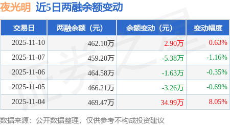 证券之星消息,11月10日,夜光明(920527)融资买入95.59万元,融资偿还92.69万元,融资净买入2.9万元,融资余额462.1万元。
