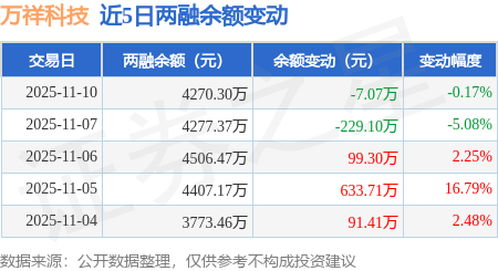 证券之星消息,11月10日,万祥科技(301180)融资买入344.61万元,融资偿还351.58万元,融资净卖出6.97万元,融资余额4258.57万元。