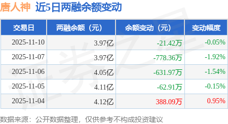 证券之星消息,11月10日,唐人神(002567)融资买入1933.43万元,融资偿还1970.35万元,融资净卖出36.92万元,融资余额3.96亿元。