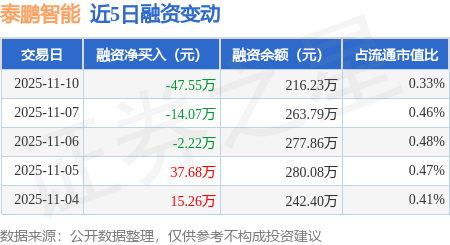 证券之星消息,11月10日,泰鹏智能(920132)融资买入95.66万元,融资偿还143.21万元,融资净卖出47.55万元,融资余额216.23万元。