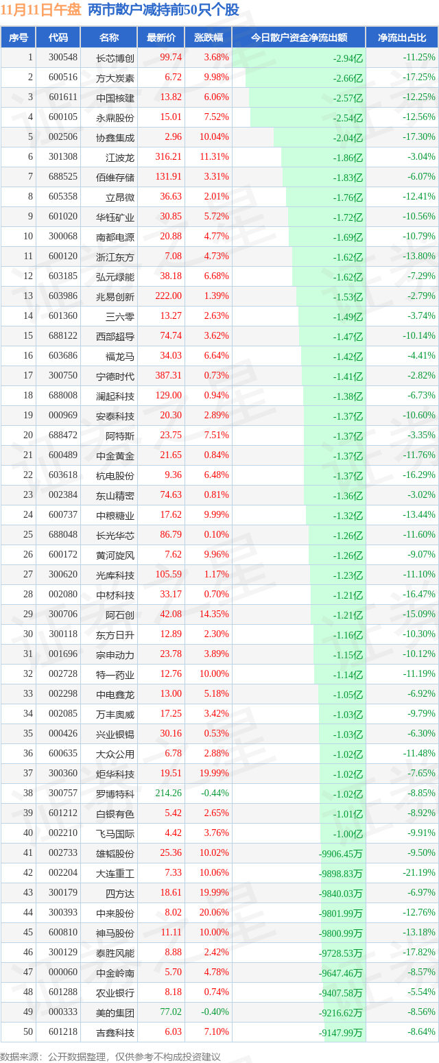 两市散户减持最多的前十只个股为: