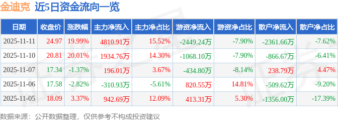 11月11日的资金流向数据方面,主力资金净流入4810.91万元,占总成交额15.52%,游资资金净流出2449.24万元,占总成交额7.9%,散户资金净流出2361.66万元,占总成交额7.62%。