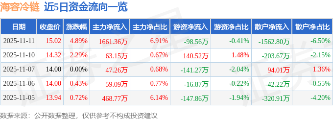 证券之星消息,截至2025年11月11日收盘,海容冷链(603187)报收于15.02元,上涨4.89%,换手率4.2%,成交量16.22万手,成交额2.4亿元。