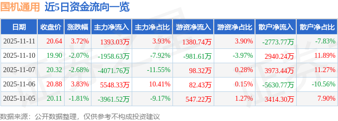11月11日的资金流向数据方面,主力资金净流入1393.03万元,占总成交额3.93%,游资资金净流入1380.74万元,占总成交额3.9%,散户资金净流出2773.77万元,占总成交额7.83%。