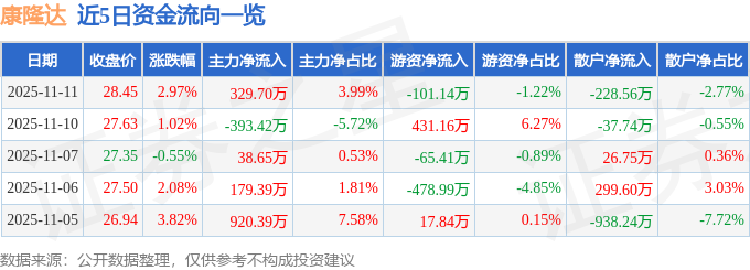 11月11日的资金流向数据方面,主力资金净流入329.7万元,占总成交额3.99%,游资资金净流出101.14万元,占总成交额1.22%,散户资金净流出228.56万元,占总成交额2.77%。