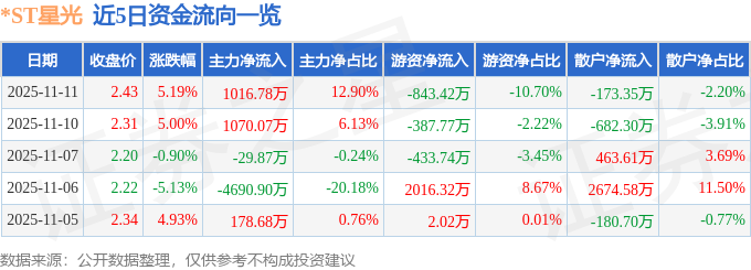 证券之星消息,截至2025年11月11日收盘,*ST星光(002076)报收于2.43元,上涨5.19%,换手率3.14%,成交量32.73万手,成交额7879.59万元。