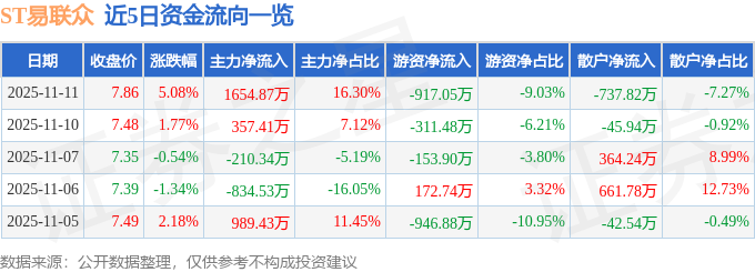 证券之星消息,截至2025年11月11日收盘,ST易联众(300096)报收于7.86元,上涨5.08%,换手率3.07%,成交量13.19万手,成交额1.02亿元。