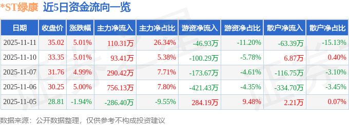 证券之星消息,截至2025年11月11日收盘,*ST绿康(002868)报收于35.02元,上涨5.01%,换手率0.08%,成交量1196.0手,成交额418.84万元。
