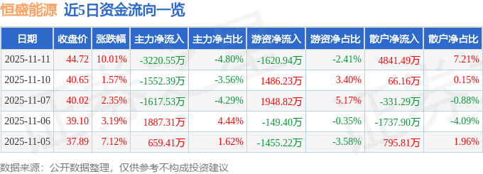 证券之星消息,恒盛能源11月11日涨停收盘,收盘价44.72元。该股于15点0分涨停,未打开涨停,截止收盘封单资金为432.53万元,占其流通市值0.03%。