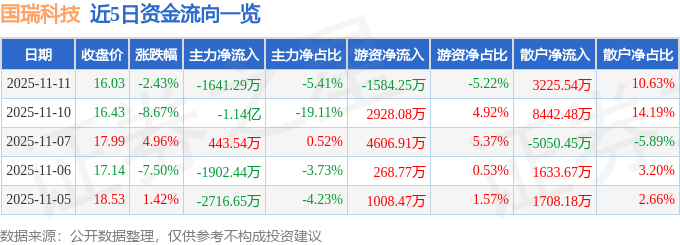 证券之星消息,截至2025年11月11日收盘,国瑞科技(300600)报收于16.03元,下跌2.43%,换手率6.43%,成交量18.92万手,成交额3.03亿元。