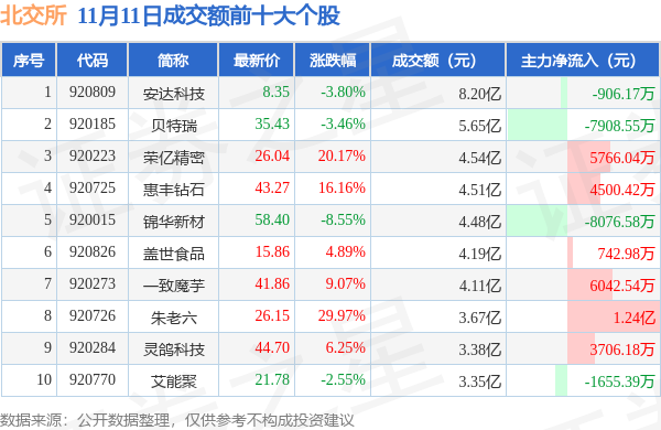 当日北交所成交额前10大个股中6只个股收涨,平均涨幅14.42%,其中安达科技(920809)以成交额8.2亿元排第一。从主力资金流入看,成交额前10大个股中有6只个股呈现主力资金净流入。