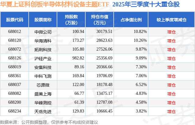 华夏上证科创板半导体材料设备主题ETF的前十大重仓股如下: