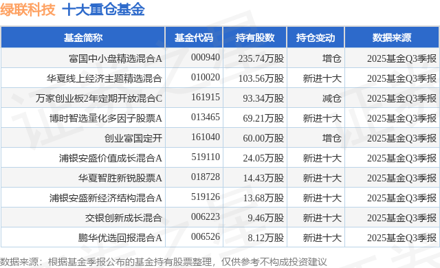 重仓绿联科技的前十大公募基金请见下表: