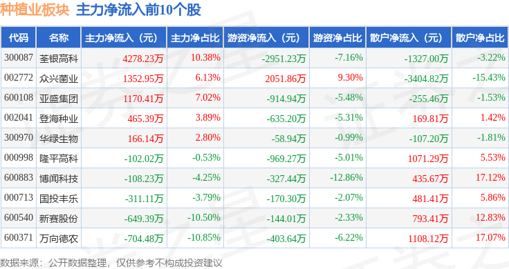 从资金流向上来看,当日种植业板块主力资金净流出1.14亿元,游资资金净流出6970.33万元,散户资金净流入1.84亿元。种植业板块个股资金流向见下表: