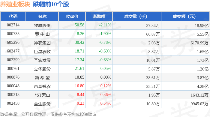 证券之星消息,11月11日养殖业板块较上一交易日下跌0.45%,牧原股份领跌。当日上证指数报收于4002.76,下跌0.39%。深证成指报收于13289.0,下跌1.03%。养殖业板块个股涨跌见下表: