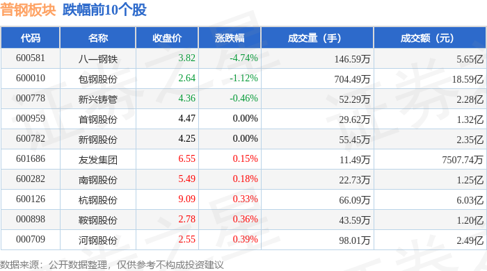 证券之星消息,11月11日普钢板块较上一交易日上涨0.54%,马钢股份领涨。当日上证指数报收于4002.76,下跌0.39%。深证成指报收于13289.0,下跌1.03%。普钢板块个股涨跌见下表:
