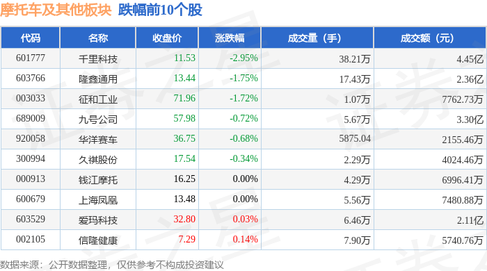 证券之星消息,11月11日摩托车及其他板块较上一交易日下跌0.83%,千里科技领跌。当日上证指数报收于4002.76,下跌0.39%。深证成指报收于13289.0,下跌1.03%。摩托车及其他板块个股涨跌见下表: