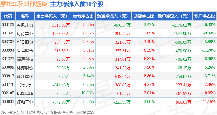 从资金流向上来看,当日摩托车及其他板块主力资金净流出1.29亿元,游资资金净流入1.23亿元,散户资金净流入619.57万元。摩托车及其他板块个股资金流向见下表: