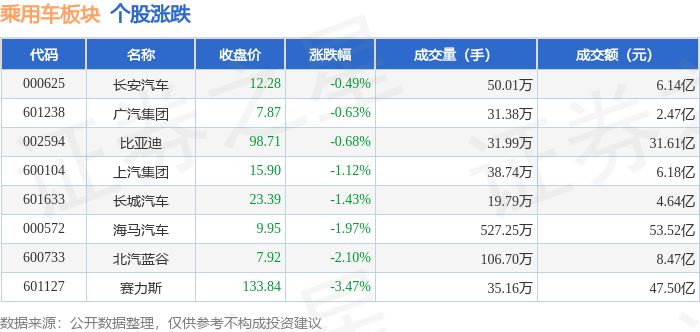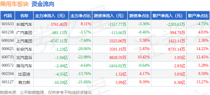 从资金流向上来看,当日乘用车板块主力资金净流出20.48亿元,游资资金净流入6.37亿元,散户资金净流入14.11亿元。乘用车板块个股资金流向见下表: